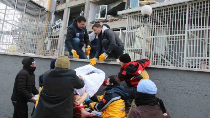 Kahramanmaraş'ın Pazarcık ilçesinde meydana gelen 7,7 büyüklüğündeki depremde hasar gören hastanede merdivenlerinin yıkılması nedeniyle mahsur kalan 4 yoğun bakım hastası, İHA muhabirlerinin çabalarıyla kurtarılarak sağlık ekiplerine teslim edildi.