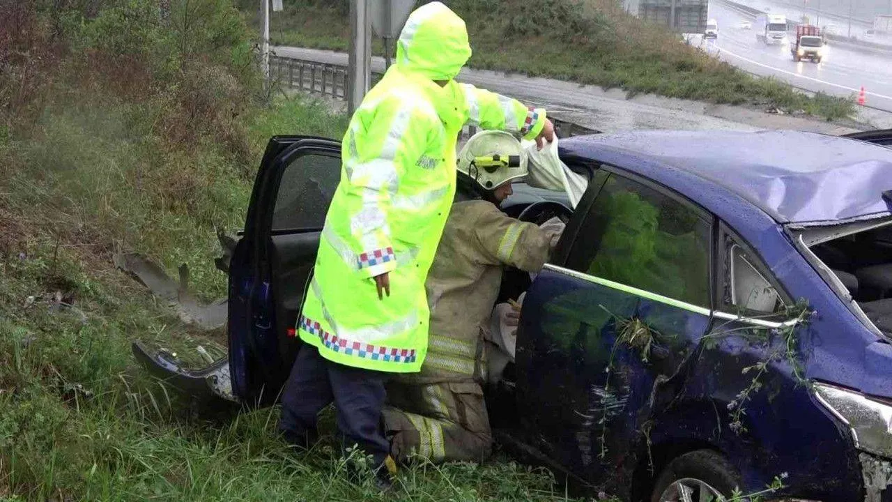 Kuzey Marmara Otoyolu Fenertepe yol ayrımı mevkiinde eşini havalimanına bırakan kadın sürücü, yağışlı havanın etkisi ile direksiyon hakimiyetini kaybederek kaza yaptı. Çayırlık alana uçan araçta sıkışan kadını bir yandan kurtarma çalışmaları yapılırken, bir yandan da bir itfaiye eri yaralı kadını sakinleştirmeye çalıştı.