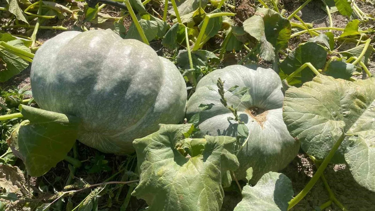 Bal kabaklarını iki haftadır görmeyen Çavdar, yaprakları kaldırdığında 40 kilograma ulaşan 2 kabak görünce mutlu oldu.
