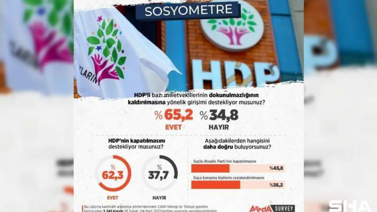 Areda Survey, vatandaşlara son dönemde kapatılma iddialarıyla çalkalanan HDP'yi sordu. 3 bin 245 kişinin katıldığı Şubat Sosyometre araştırmasına göre 'HDP kapatılsın' diyenlerin oranı yüzde 62.3 oldu. Araştırmada ayrıca HDP'li bazı vekillerin dokunulmazlığının kaldırılmasına ilişkin girişimleri destekleyenlerin oranı yüzde 65.2.
