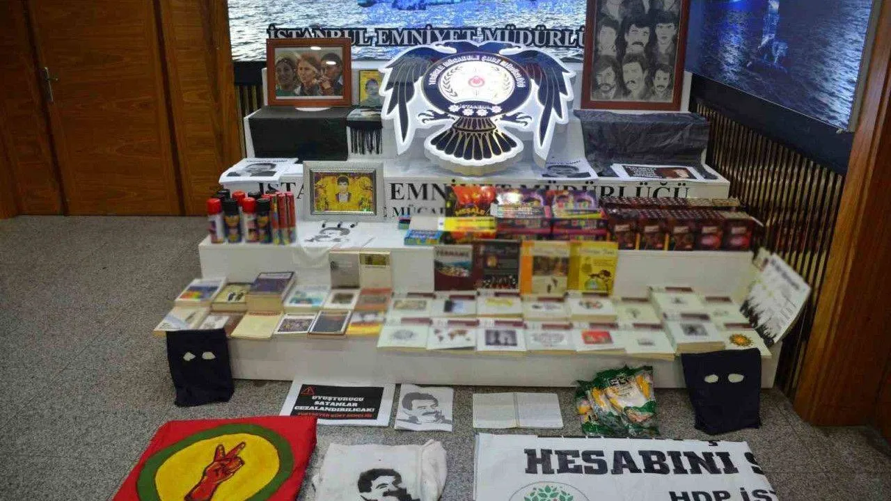 İstanbul’da bölücü terör örgütü PKK’nın gençlik yapılanması DGH üyelerine yönelik yürütülen soruşturma çerçevesinde, Halkların Demokratik Partisi (HDP) Şişli Okmeydanı Temsilcilik binasının deposuna yapılan operasyonda, örgüt elebaşı Abdullah Öcalan’ın afiş ve posterlerinin yanı sıra, korsan gösteri ve yürüyüşlerde kullanılabileceği değerlendirilen 8 eldiven, 10 sprey, 2 yüz maskesi, 3 yelek, 85 meşale, 10 havai fişek rampası ve 67 torpil ele geçirildi.