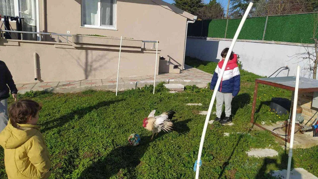 Çatalca’da bir evin bahçesinde beslenen "Efe" isimli horozun futbol aşkı kameralara yansıdı. Çocuklarla birlikte top oynayan horoz, futbolculara taş çıkardı.