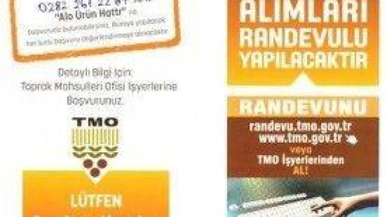 Üreticiler taahhütnameli alımın başladığı tarihten itibaren randevu alabilecek, randevu tarihinde en geç saat 14: 00'e kadar TMO işyerlerine gelen ürün sahipleri ürünlerini aynı gün içinde ve randevu aldıkları sıra ile teslim edebileceklerdir. Üreticilerin, randevu almadan önce İl/İlçe Gıda, Tarım ve Hayvancılık Müdürlüklerinden ÇKS bilgilerini güncellemeleri gerekmektedir. Üreticiler yalnızca ÇKS'deki üretim miktarı kadar randevu alabileceklerdir. Bu nedenle ÇKS bilgilerinin güncellenmesi önem arz etmektedir. Banka kartı olanların alım işlemleri daha kısa sürede tamamlanacağından, ürün teslimi sırasında anlaşmalı bankalardan alınacak "TMO Banka Kartı" ile gelinmesi işlemleri kolaylaştıracaktır. Herhangi bir mağduriyetin önlenmesi açısından, daha önce alınmış olan banka kartlarının aktif durumda olup olmadığının ilgili bankalardan kontrol edilmesi önemlidir. Tüm işyerleri için randevu alma işlemi TMO Şube Müdürlükleri ile Ajans Amirliklerinden veya http: //randevu.tmo.gov.tr, www.randevu.tmo.gov.tr ve www.tmo.gov.tr internet adresleri üzerinden yapılabilecektir. Telefonla randevu verilmeyecektir" dedi.