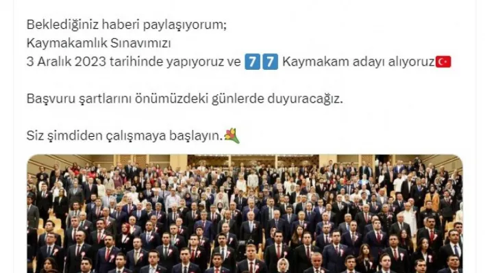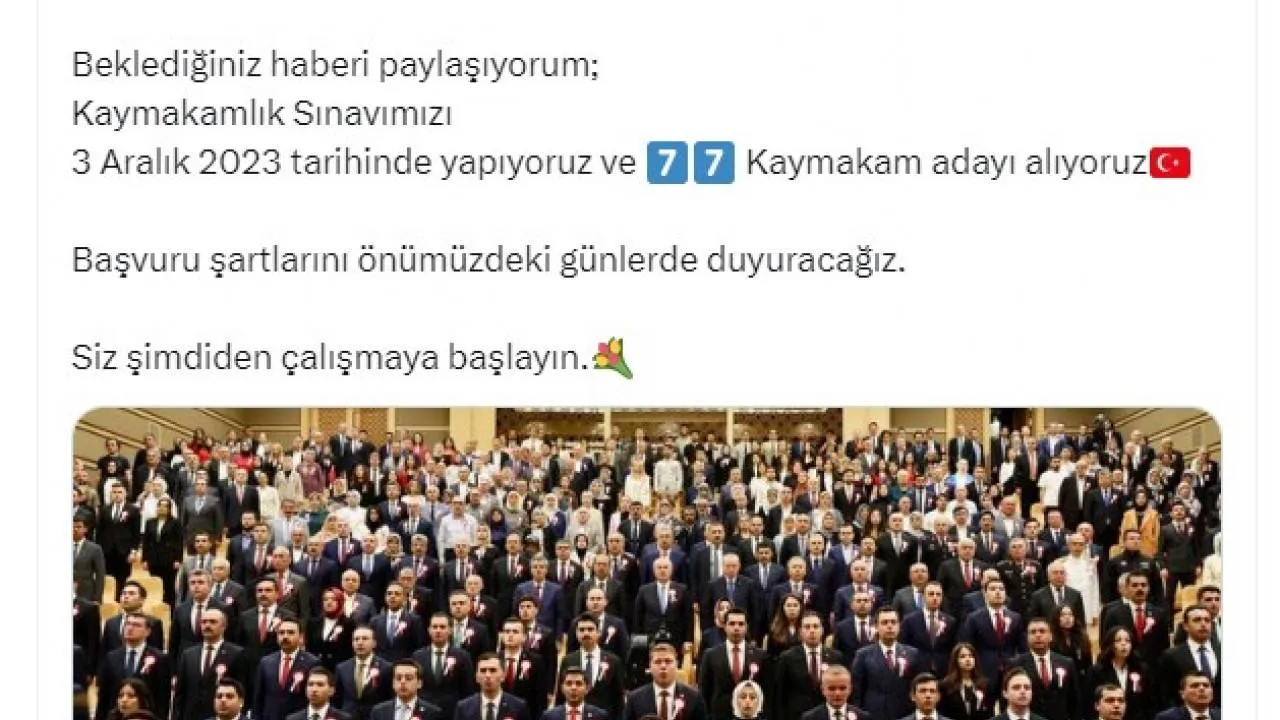 Bakan Yerlikaya, sosyal medya hesabından yeni kaymakam adayı alımına ilişkin yaptığı paylaşımda, "Kaymakam olup İçişleri Bakanlığı ailemize katılmak isteyen, geleceğin mülki idare amiri olarak vatanımıza hizmet etmeyi arzulayan kıymetli arkadaşlarım. Beklediğiniz haberi paylaşıyorum; Kaymakamlık Sınavımızı 3 Aralık 2023’te yapıyoruz ve 77 kaymakam adayı alıyoruz. Başvuru şartlarını önümüzdeki günlerde duyuracağız. Siz şimdiden çalışmaya başlayın" ifadelerini kullandı.