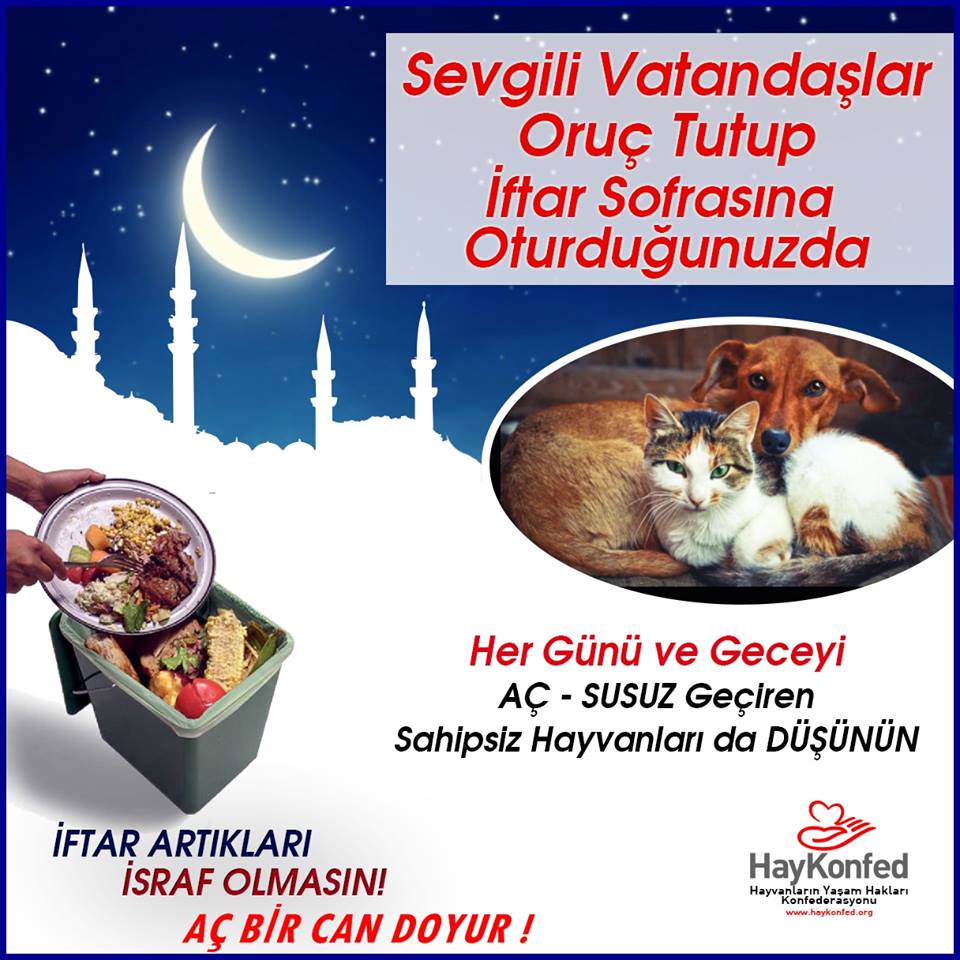 Bu bağlamda "Bu mübarek Ramazan'da, oruç tutup iftar sofrasına oturduğunuzda, suyunuzu kana kana içip yemeğinizi doya doya yediğinizde, her günü ve her geceyi AÇ SUSUZ geçiren SAHİPSİZ HAYVANLARI da düşünün. İftar sofralarının artıkları ÇÖP OLMASIN. Kalmış yemekleri kedi ve köpekler için sokağınıza koyarak BİR AÇ CAN DOYURABİLİRSİNİZ. Unutmayın, Hz Muhammed (sav) 'Hayvanlara yapılan iyilikte de sevap vardır' buyurmuştur."