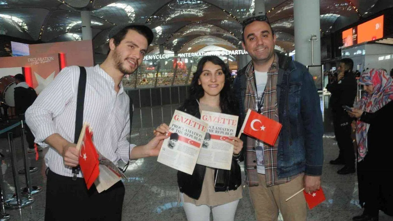 Ayrıca iç hatlar ve dış hatlarda dönem kıyafeti giyen gençler, sepetli bisiklet ile Türk bayrağı ve Cumhuriyet gazetesi dağıtırken, İGA İstanbul Havalimanı’nda Cumhuriyet’in 99’uncu yılı ve İGA’nın 4’üncü doğum günü coşkuyla kutlandı.