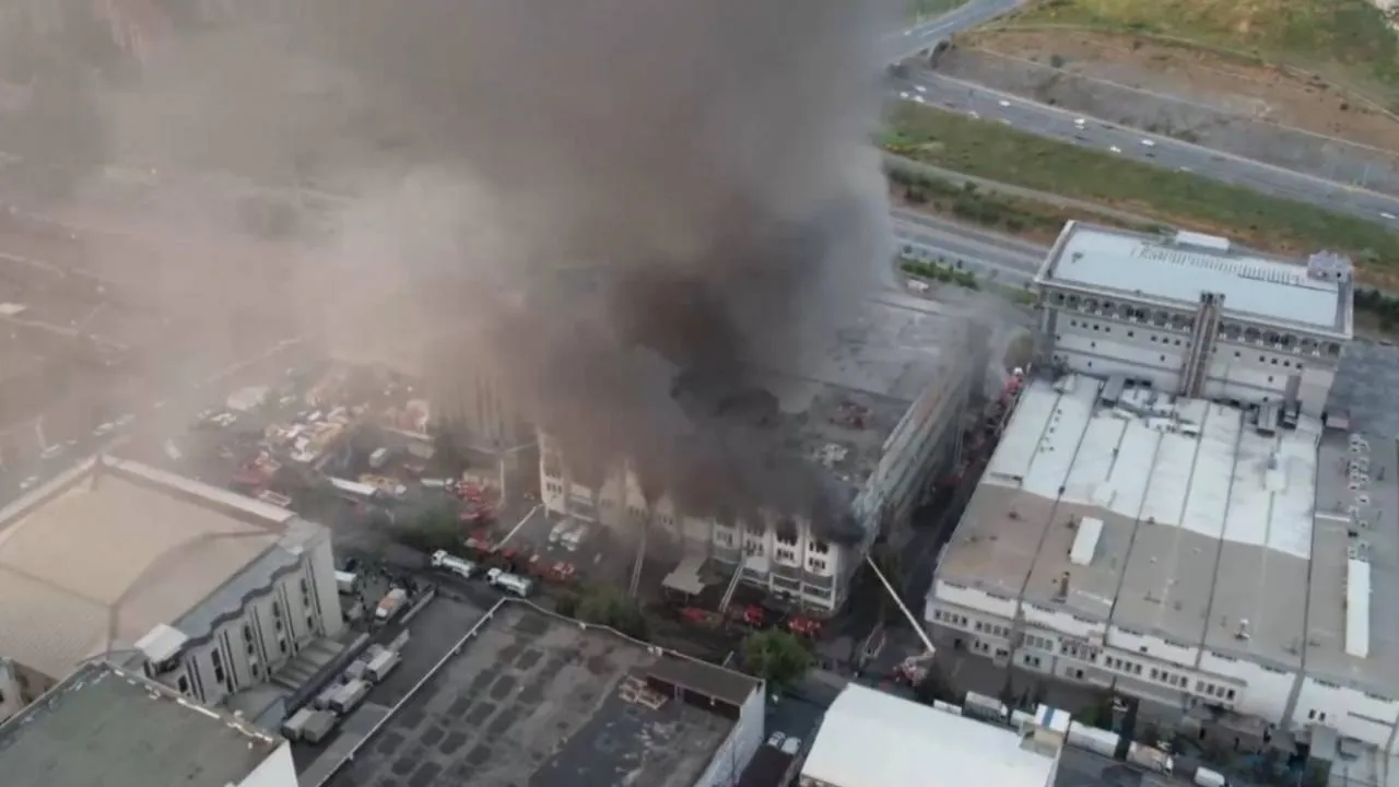 Başakşehir’de İkitelli Organize Sanayi Bölgesi’nde 6 katlı iş hanında çıkan yangın dron ile havadan görüntülendi.