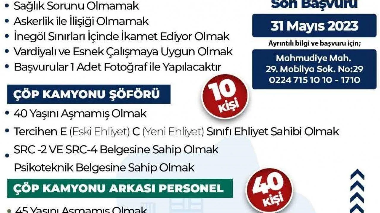 “Kurumumuz bünyesinde istihdam edilmek üzere 50 personel alımı yapılacak. İlçe halkımıza en iyi hizmeti sunmak adına yapılan alım çerçevesinde; 10 çöp kamyonu şoförü ve 40 çöp kamyonu arkası personeli olmak üzere toplam 50 kişi istihdam edilecek. Başvuruda bulunmak isteyen vatandaşlarımızın 31 Mart 2023 Cuma günü 17.00’a kadar Mahmudiye Mahallesi 29. Mobilya Sokak No:29 adresine bizzat başvurmaları gerekmektedir. Detaylı bilgi almak isteyen vatandaşlarımız da 0224 715 10 10 no’lu telefondan 1710 dahili hattını bağlatarak bilgi alabilirler. Başvuracak adaylarda aranan şartlar ise; herhangi bir sağlık sorunu olmaması, askerlik ile ilişiği olmaması, İnegöl sınırları içerisinde ikamet ediyor olmak, vardiyalı ve esnek çalışmaya uygun olmak. Başvurular aynı zamanda 1 adet fotoğraf ile yapılacaktır. 10 kişilik çöp kamyonu şoförü alımı için ayrıca istenen şartlar; 40 yaşını aşmamış, tercihen E (eski ehliyet) C (yeni ehliyet) sınıfı ehliyet sahibi olmak, SRC-2 ve SRC-4 belgelerine sahip olmak ve Psikoteknik belgesine sahip olmak. 40 kişilik çöp kamyonu arkası personel için ise 45 yaşını aşmamış olmak şartı aranıyor.”