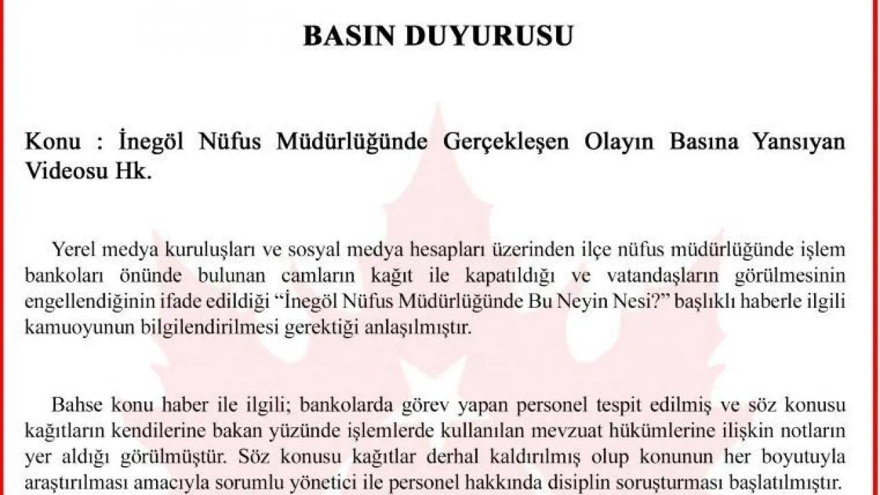 Sosyal medyada paylaşılan görüntülerde iddiaya göre İnegöl Nüfus Müdürlüğü’nde vatandaşla memur arasındaki cama A4 kağıtları yapıştırılmıştı. Konu ile ilgili Bursa Valiliğinden yapılan açıklamada, “Yerel medya kuruluşları ve sosyal medya hesapları üzerinden ilçe nüfus müdürlüğünde işlem bankoları önünde bulunan camların kağıt ile kapatıldığı ve vatandaşların görülmesinin engellendiğinin ifade edildiği, "İnegöl Nüfus Müdürlüğünde Bu Neyin Nesi?" başlıklı haberle ilgili kamuoyunun bilgilendirilmesi gerektiği anlaşılmıştır. Bahse konu haber ile ilgili, bankolarda görev yapan personel tespit edilmiş ve söz konusu kağıtların kendilerine bakan yüzünde işlemlerde kullanılan mevzuat hükümlerine ilişkin notların yer aldığı görülmüştür. Söz konusu kağıtlar derhal kaldırılmış olup, konunun her boyutuyla araştırılması amacıyla sorumlu yönetici ile personel hakkında disiplin soruşturması başlatılmıştır. Kamuoyuna saygıyla duyurulur” ifadelerine yer verildi.