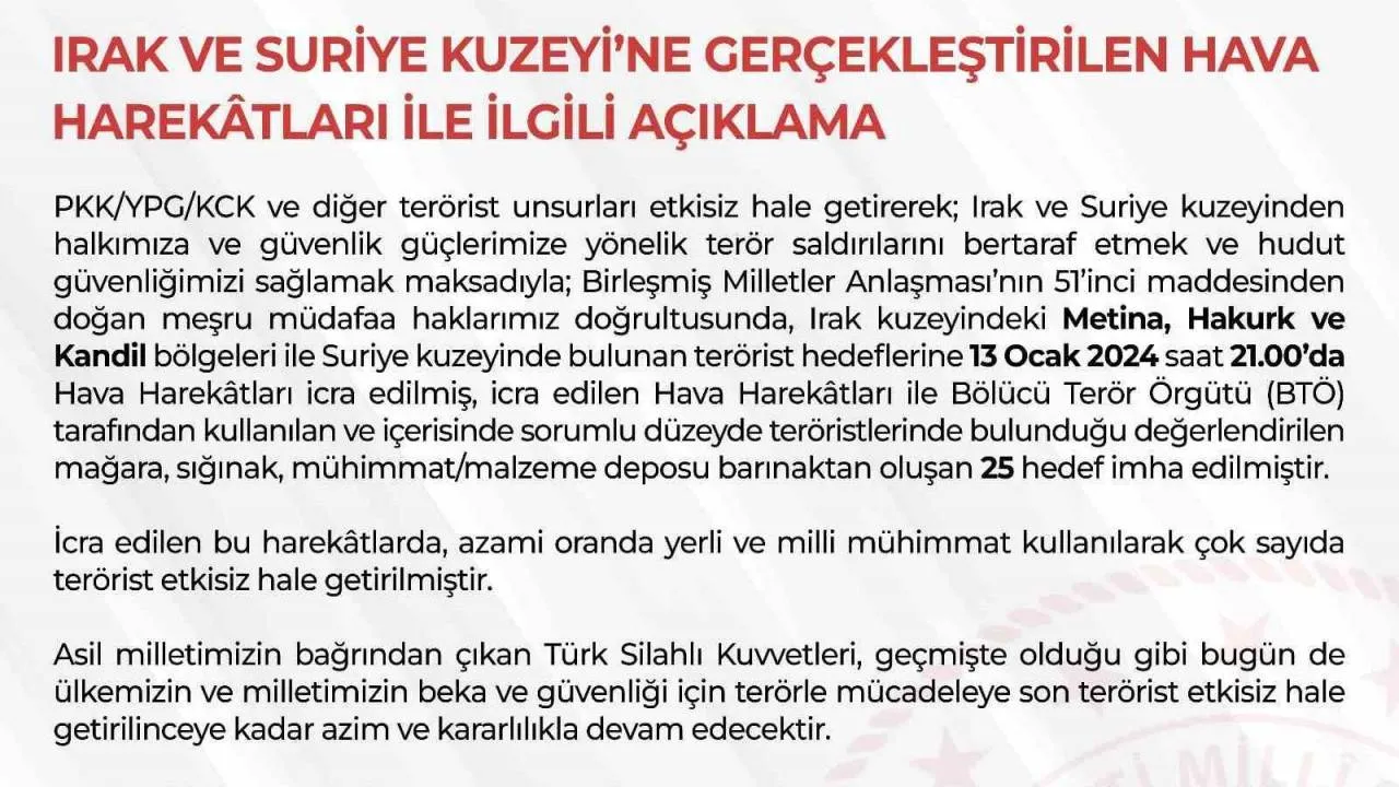 Milli Savunma Bakanlığı, Irak'ın ve Suriye'nin kuzeyindeki terörist hedeflere yönelik düzenlenen hava harekatında 25 hedefin imha edildiğini, çok sayıda teröristin etkisiz hale getirildiğini açıkladı.