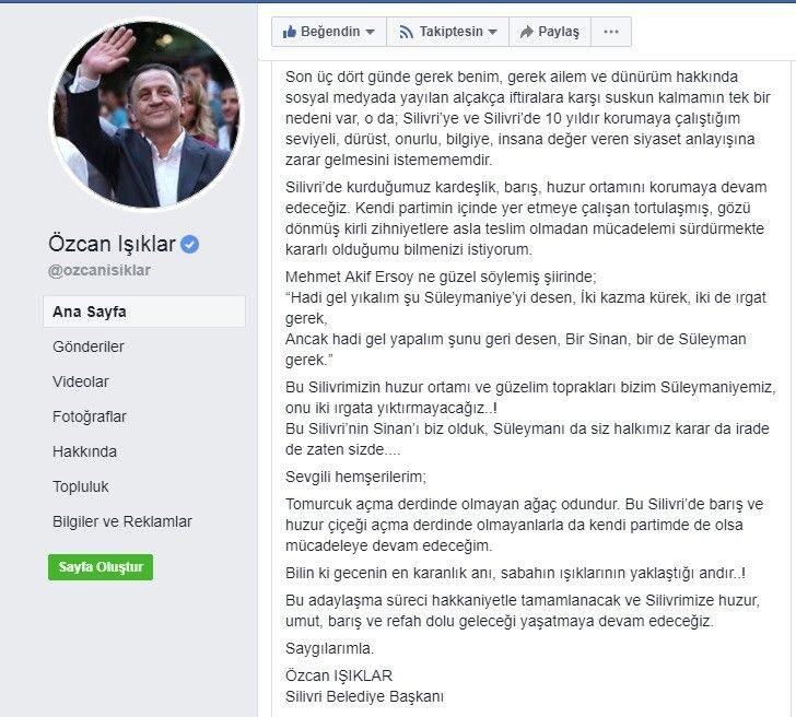 Son üç dört günde gerek benim gerek ailem ve dünürüm hakkında sosyal medyada yayılan alçakça iftiralara karşı suskun kalmamın tek bir nedeni var, o da; Silivri’ye ve Silivri’de 10 yıldır korumaya çalıştığım seviyeli, dürüst, onurlu, bilgiye, insana değer veren siyaset anlayışına zarar gelmesini istemememdir.