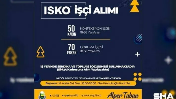 İnegöl Belediyesi İstihdam Merkezinden yapılan açıklamada, İnegöl Organize Sanayi Bölgesinde üretimini sürdüren İSKO tekstil firmasında çalışmak üzere personel alımı yapılacağı duyuruldu. Açıklamada şu ifadelere yer verildi: