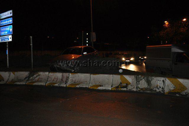 Akşam saatlerinde yaşanan kaza Konutları çay bahçesi önündeki yol ayrımında meydana geldi. Sürücüsünün kontrolü kaybetmesi üzerine ıslak ve kaygan olan yolda öndeki kamyonete çarparak orta refüje çıkan araçta ölen yada yaralanın olmadığı kaza maddi hasarla atlatıldı.