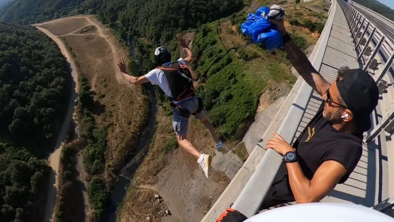 İstanbul Arnavutköy'de bir grup ekstrem spor tutkunu, 86 metre yüksekliğindeki viyadüğün üzerine çıkarak paraşütle atladı. Adrenalin dolu anlar dron ve kask kameralarıyla görüntülendi.