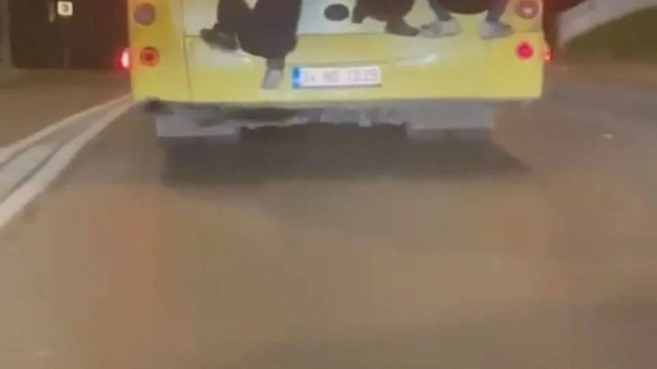 Şişli Kadırgalar Caddesi üzerinde kaydedilen görüntülerde, üç genç hızla giden İETT otobüsünün arkasındaki pencere lastiklerine tutunmuş ve çömelmiş bir şekilde tehlikeli yolculuk yaptı. Otobüsün arkasında adeta “örümcek adam” gibi tırmanarak seyreden gençler yürekleri ağza getirdi. Taksim Tarlabaşı Bulvarı’nda ise bir genç otobüsün arkasına tırmanıp pencereye tutunarak seyretti.