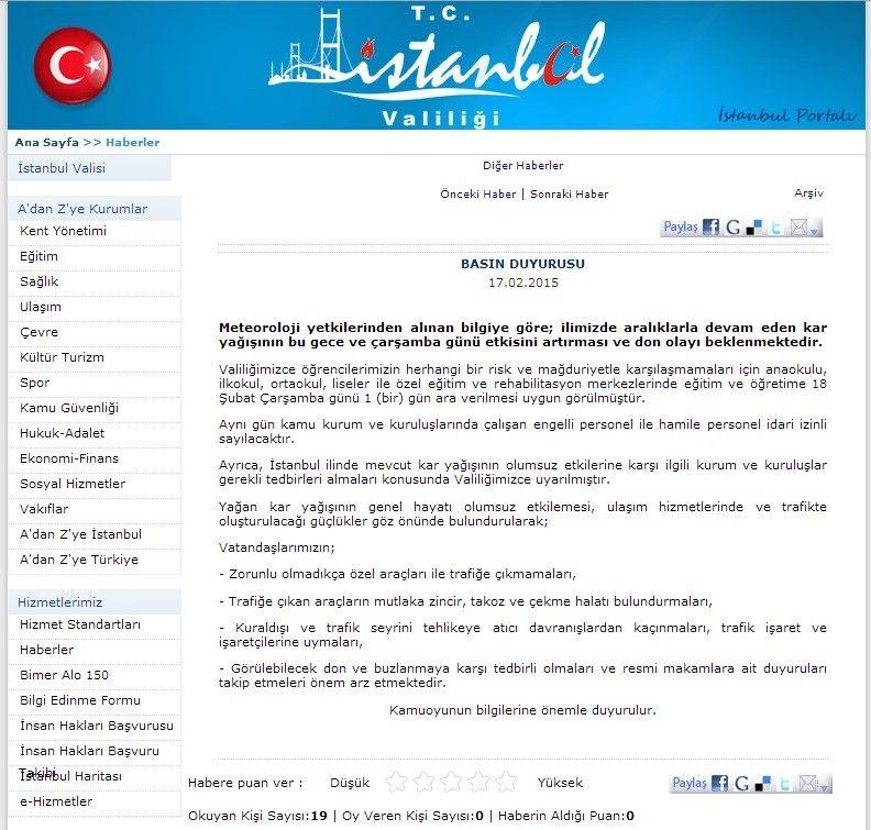 Ayrıca, İstanbul ilinde mevcut kar yağışının olumsuz etkilerine karşı ilgili kurum ve kuruluşlar gerekli tedbirleri almaları konusunda Valiliğimizce uyarılmıştır.