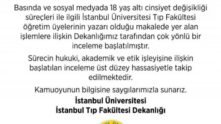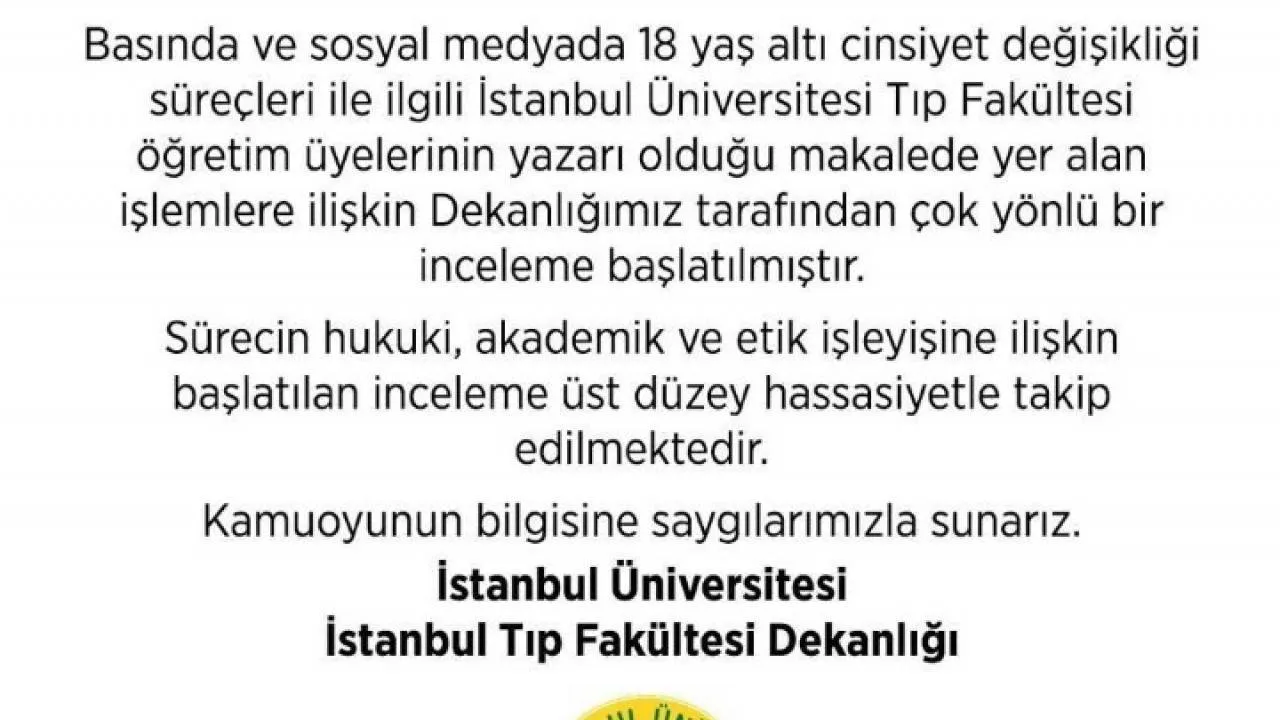 İstanbul Üniversitesi İstanbul Tıp Fakültesi Dekanlığı tepkilere neden olan fakülte öğretim üyelerinin yazarı olduğu 18 yaş altındaki çocukların cinsiyet değişikliği süreçleriyle ilgili makalede yer alan işlemlere yönelik çok yönlü bir inceleme başlatıldığını duyurdu. Konuya ilişkin yapılan açıklamada, Dekanlığımız tarafından çok yönlü bir inceleme başlatılmıştır. Sürecin hukuki, akademik ve etik işleyişine ilişkin başlatılan inceleme üst düzey hassasiyetle takip edilmektedir denildi.