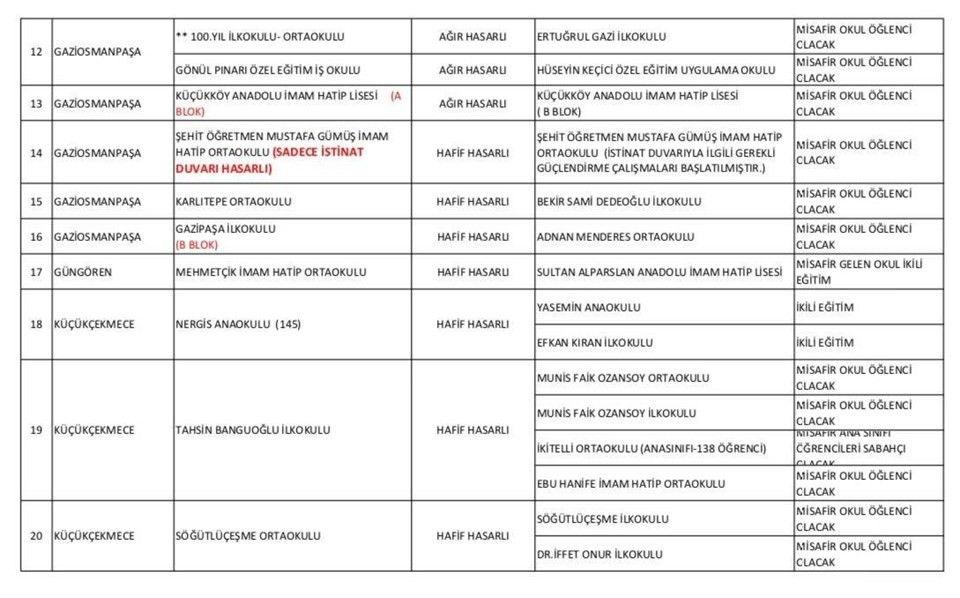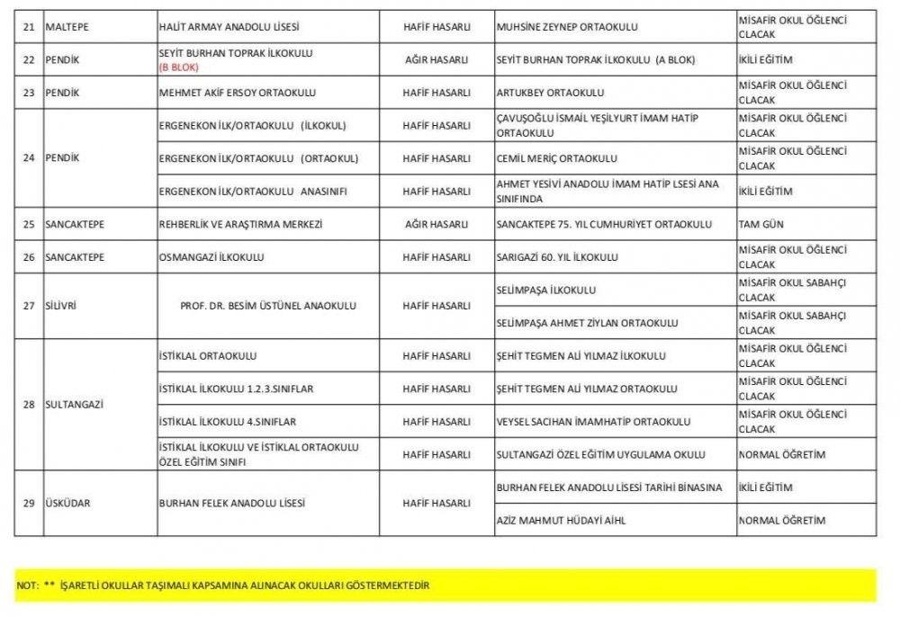 İstanbul Valiliği, ağır hasarlı olduğu gerekçesiyle eğitime ara verilen okullardaki öğrencilerin devam edeceği okulları açıkladı.