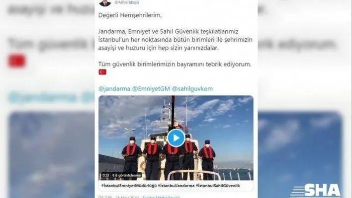 İstanbul Valisi Ali Yerlikaya, resmi sosyal medya hesabı üzerinden anlamlı bir paylaşım yaptı. Yerlikaya, güvenlik birimlerinin herkesin bayramını kutladığı bir video paylaştı. Kendisi de tüm güvenlik birimlerinin bayramını tebrik eden Yerlikaya videonun üzerine şu notu yazdı: "Değerli Hemşehrilerim, Jandarma, Emniyet ve Sahil Güvenlik teşkilatlarımız İstanbul’un her noktasında bütün birimleri ile şehrimizin asayişi ve huzuru için hep sizin yanınızdalar. Tüm güvenlik birimlerimizin bayramını tebrik ediyorum."