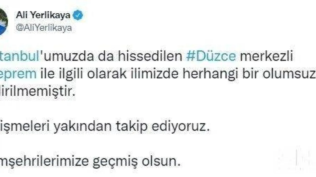 İstanbul Valisi Ali Yerlikaya, sosyal medya hesabından yaptığı paylaşımda, “İstanbul’umuzda da hissedilen Düzce merkezli deprem ile ilgili olarak ilimizde herhangi bir olumsuzluk bildirilmemiştir. Gelişmeleri yakından takip ediyoruz. Hemşerilerimize geçmiş olsun” ifadelerini kullandı.