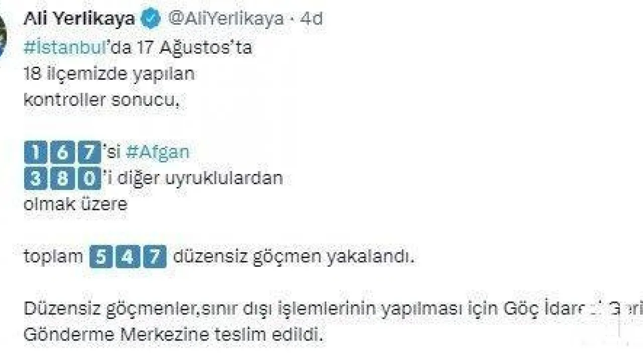 İstanbul Valisi Ali Yerlikaya, sosyal medya hesabından yaptığı paylaşımda, düzensiz göçmenlere ilişkin İstanbul'da 18 ilçede yapılan kontrollerde 547 düzensiz göçmenin yakalandığını açıkladı.