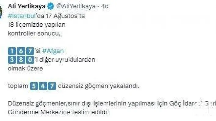 İstanbul Valisi Ali Yerlikaya, sosyal medya hesabından yaptığı paylaşımda, düzensiz göçmenlere ilişkin İstanbul’da 18 ilçede yapılan kontrollerde 547 düzensiz göçmenin yakalandığını açıkladı. İstanbul Valisi Ali Yerlikaya sosyal medya hesabından yaptığı paylaşımda, düzensiz göçmenlere yönelik kontrol yapıldığını açıkladı. İstanbul’da 18 ilçede dün gerçekleşen kontrollerde toplamda 547 düzensiz göçmen yakalandığını kaydetti. Yakalanan düzensiz göçmenlerin sınır dışı işlemlerinin yapılması için Geri Gönderme Merkezi’ne teslim edileceğini belirten Vali Yerlikaya, kontrollerin devam edeceğini belirtti.