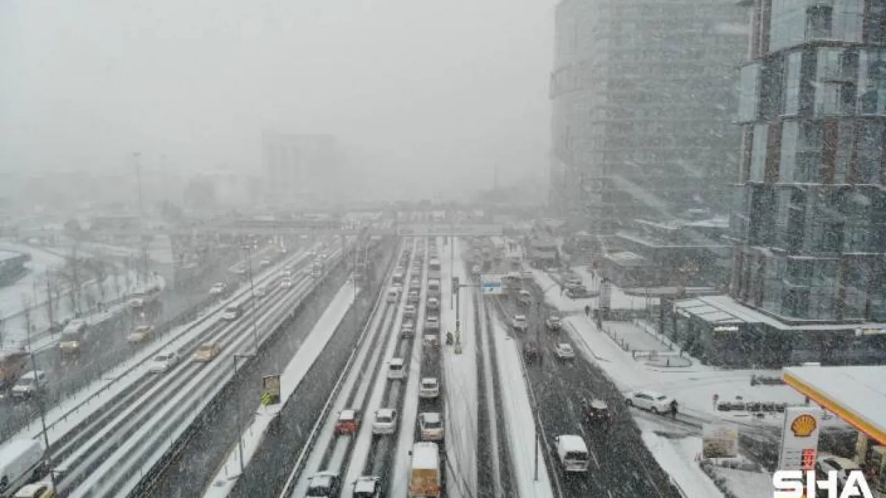 İstanbul'da sabah etkili olan kar yağışı sonrası trafik adeta durma noktasına geldi. Yüzde 82 seviyesine kadar çıkan yoğunluk havadan drone kamerası ile kaydedildi.