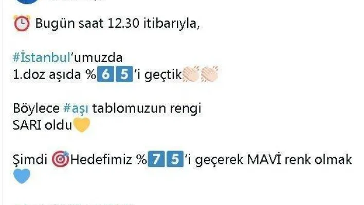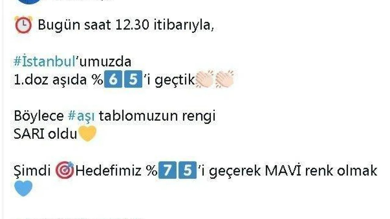 İstanbul Valisi Ali Yerlikaya, sosyal medya hesabından, "İstanbul’umuzda 1.doz aşıda yüzde 65’i geçtik. Böylece aşı tablomuzun rengi SARI oldu. Şimdi Hedefimiz yüzde 75’i ge geçerek mavi renk olmak” ifadelerini kullandı.