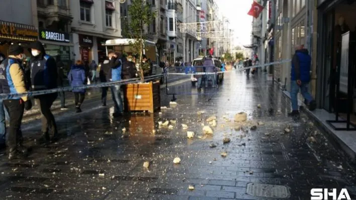 Taksim İstiklal Caddesi'nde tarihi bir binanın kenarındaki taş saçak koparak bir mağazanın önüne düştü. O esnada taşın düştüğü yerde kimsenin olmaması faciayı önledi.