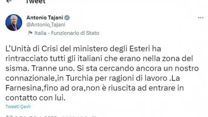 İtalya Başbakan Yardımcısı ve Dışişleri Bakanı Antonio Tajani, Türkiye'de deprem bölgesinde bulunan İtalyanlarla temasa geçtiklerini, 1 İtalyan'a ise ulaşamadıklarını açıkladı.
