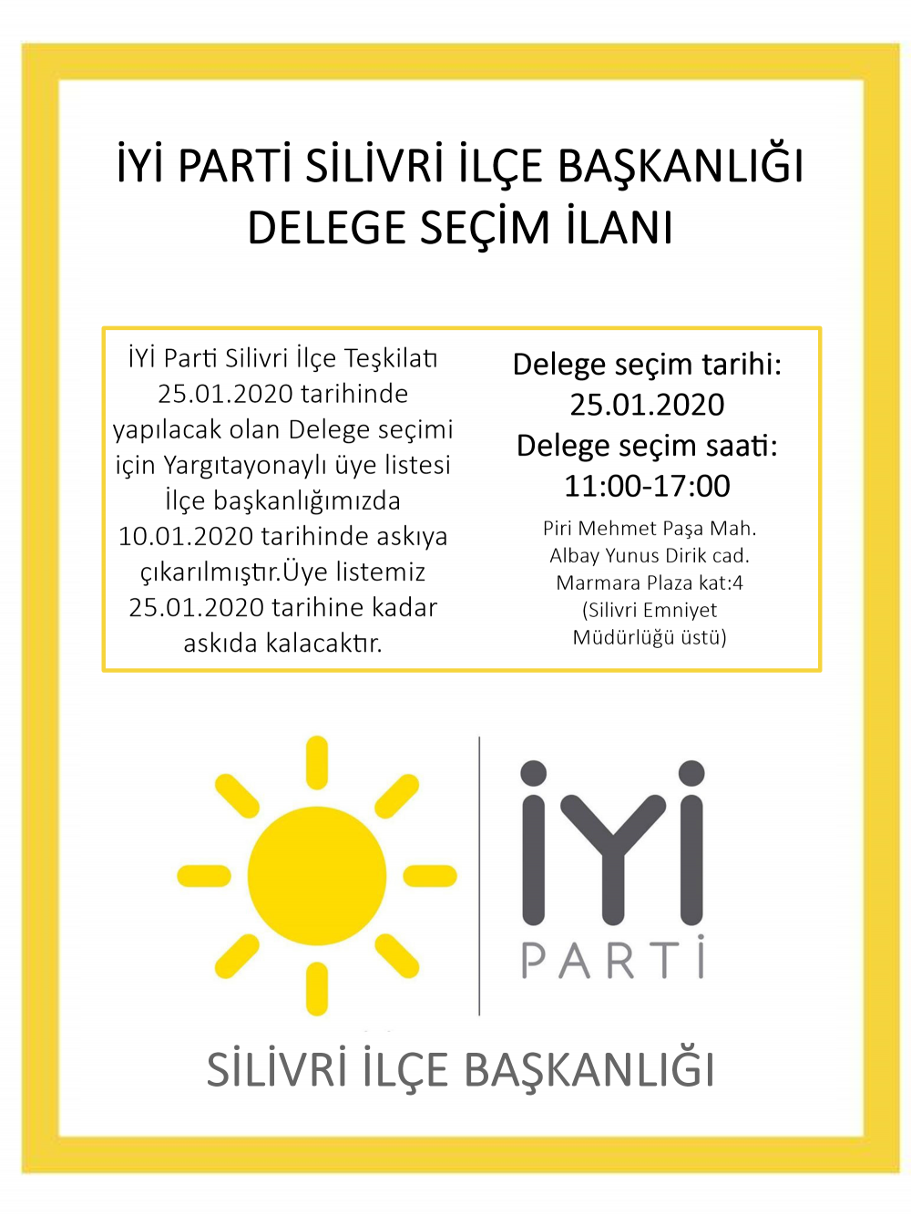 Yargıtay onaylı İYİ Parti Üyeleri kongrede oy kullanacakları delegeleri 25 Ocak 2020 günü ilçe binasında yapılacak olan seçimle belirleyecek. Delege seçimleri 11.00 de başlayıp saat 17.00 de sona erecek. İYİ Parti Silivri İlçe Başkanı A.Refik BEK yaptığı açıklamada tüm parti üyelerini 25-Ocak - 2020 de yapılacak delege seçimlerinde oy kullanmaya davet etti.