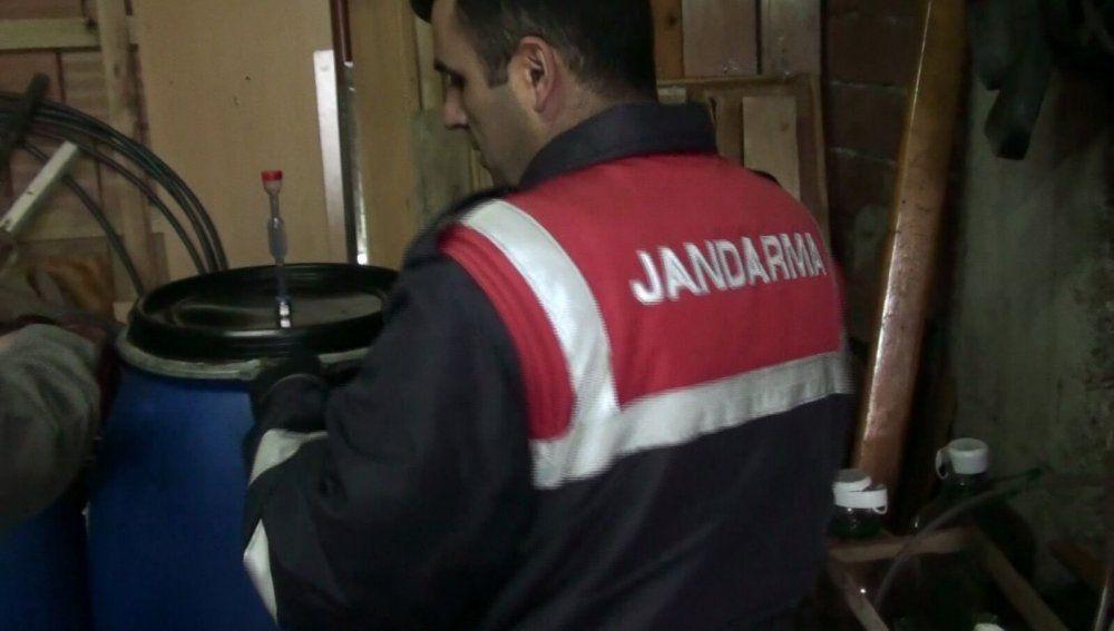 Jandarma ekipleri kaçak içki imalathanesindeki malzemelere el koydu.