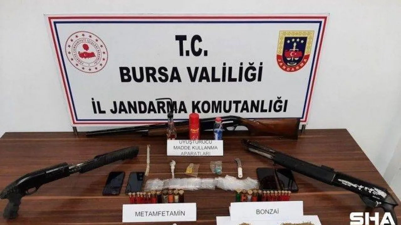 Bursa İl Jandarma Komutanlığına bağlı ekipler uyuşturucu ile mücadele kapsamında Osmangazi’nin Çağlayan Mahallesinde yol kenarına park edilmiş 3 araç içerisinde bekleyen A.S, E.D, N.B.S. ve C.S.‘nin yapılan GBT sorgulamalarının ardından araçlarında arama yaptı. 70 gram metamfetamin, 30 gram bonzai, 3 adet uyuşturucu madde kullanma aparatı, çok sayıda şeffaf kilitli poşet, çakmak gazı, 2 adet ruhsatsız pompalı tüfek, 1 adet ruhsatsız av tüfeği, 25 adet fişek, 4 adet cep telefonu ve aparat yapımında kullanılan macun ele geçirildi. A.S, E.D, C.S, ve N.B.S. karakoldaki işlemlerinin ardından adliyeye sevk edildi.