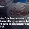 İstanbul’da uyuşturucu madde imalatçısı zehir tacirlerine ve toplum sağlığı düşmanlarına yönelik jandarma tarafından düzenlenen operasyonlarda 150 bin adet sentetik uyuşturucu hap ile bin 230 kutu kaçak kanser ilacı ele geçirildi. 6 şüpheli yakalandı.