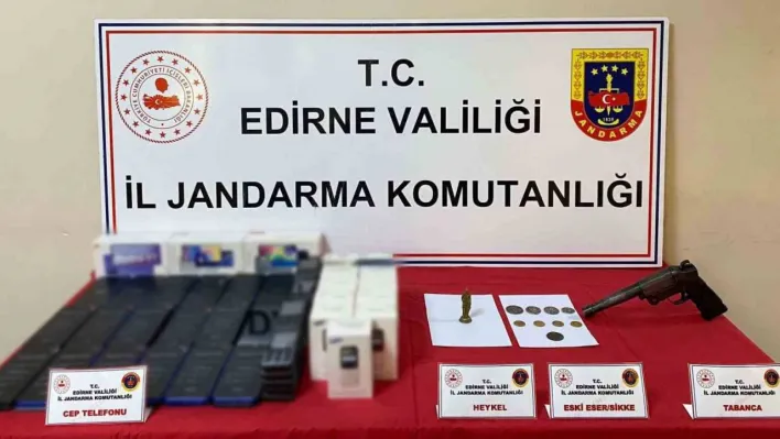 Edirne'nin Keşan ilçesinde jandarma ekiplerince E.S. isimli şahsın ev ve eklentilerinde yapılan aramada tarihi eser, kaçak cep telefonu ve bataryası ele geçirildi.