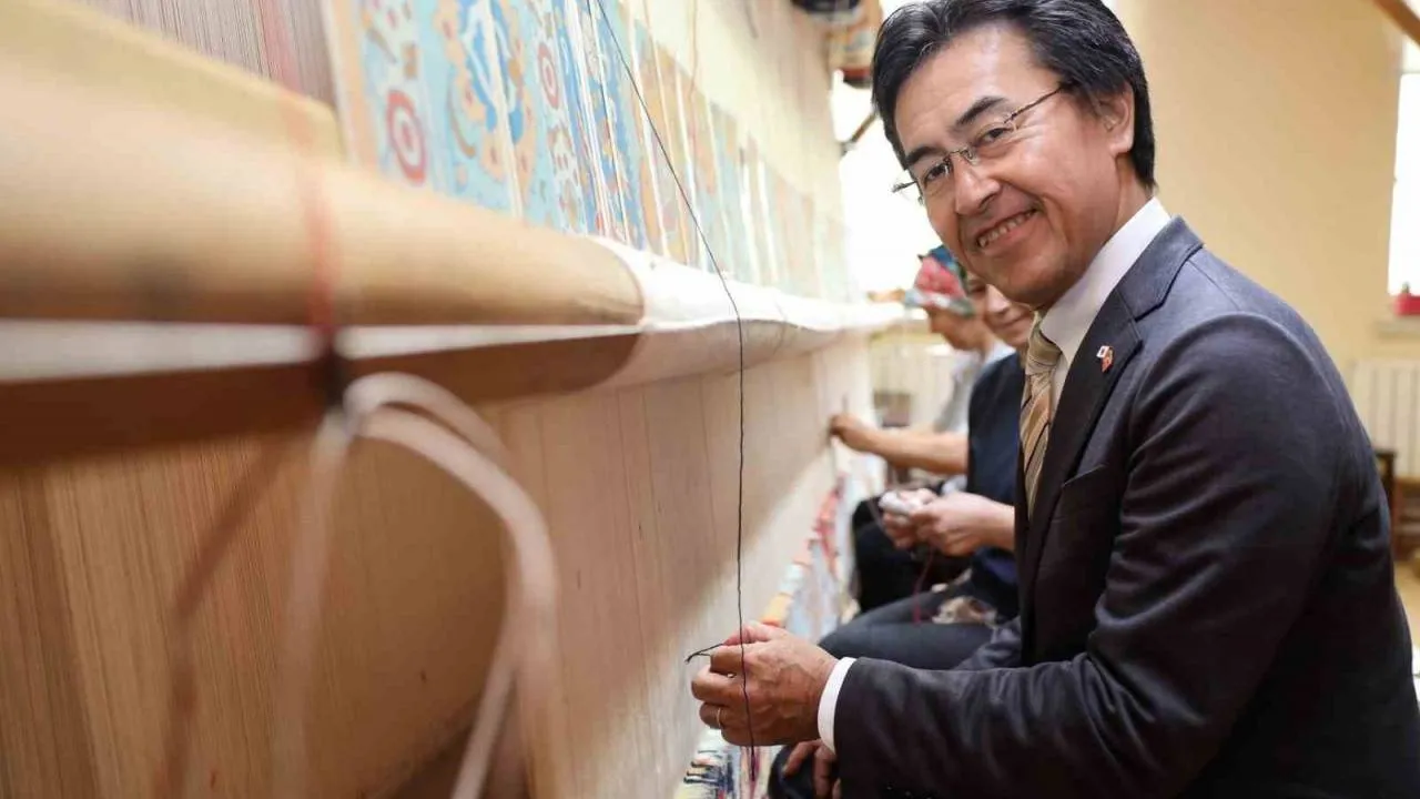 Körfez’in tarihi güzelliklerini incelemek için Hereke’ye gelen Japonya İstanbul Başkonsolosu Kasahara Kenichi, sarayları ve köşkleri süsleyen tarihi Hereke Halısı’na hayran kaldı. Tezgah başına da geçen başkonsolos, ilk ilmiği de attı.