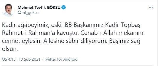Cumhurbaşkanı Recep Tayyip Erdoğan twitter üzerinden yaptığı paylaşımda, "İstanbul Büyükşehir Belediyesi eski Başkanı, kıymetli yol arkadaşımız Kadir Topbaş'ın vefatını derin bir teessürle öğrendim. Kadir Bey'i, İstanbul'a ve ülkemize kattıklarını unutmayacağız. Kendisine Allah'tan rahmet; ailesine, sevenlerine ve milletimize başsağlığı diliyorum" dedi.