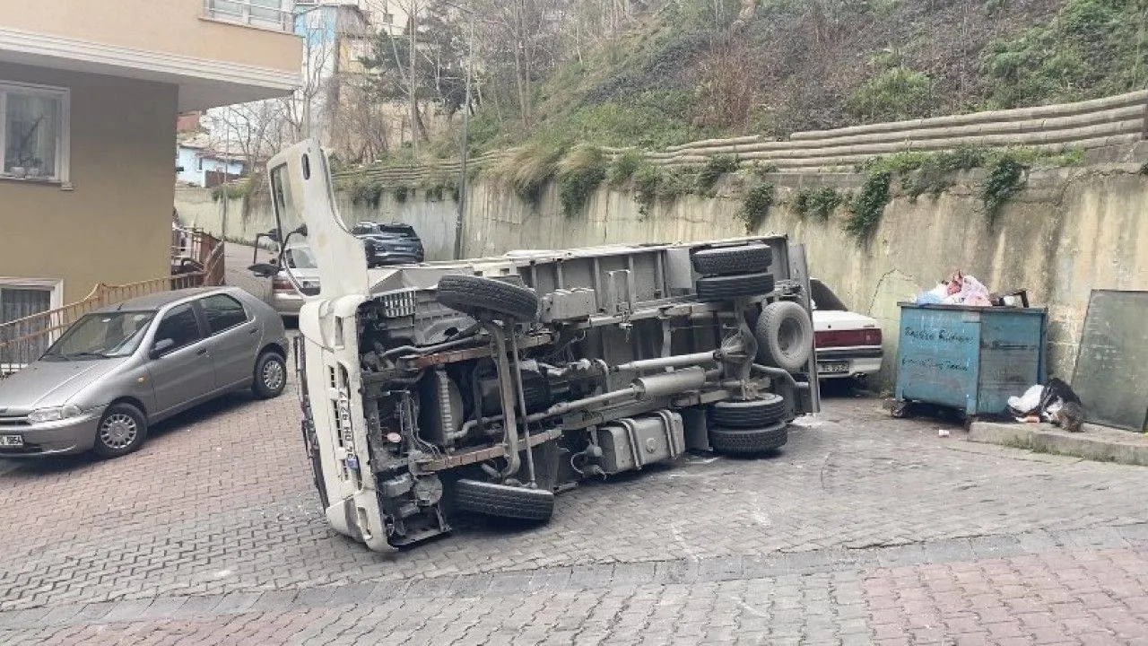 Kağıthane'de yokuş aşağıya inen çimento yüklü kamyonet, sokağa gireceği esnada devrilerek yan yattı. Metrelerce sürüklenen kamyonet, yol üzerinde bulunan park halindeki araçları teğet geçti.