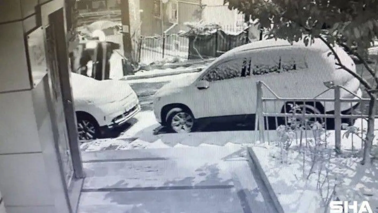 Kağıthane'de karlı yolda yokuş aşağıya inen araç, kaldırıma çarparak devrildi. Kaza anı kameralara yansırken, sürücü yara almadan kurtuldu.
