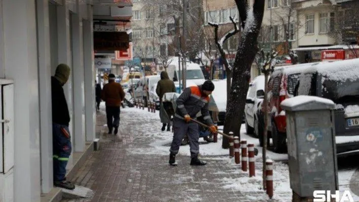 İnegöl Belediyesi, vatandaşların kar ve buzlanma sebebiyle kayıp düşmemeleri için kaldırımları temizliyor.