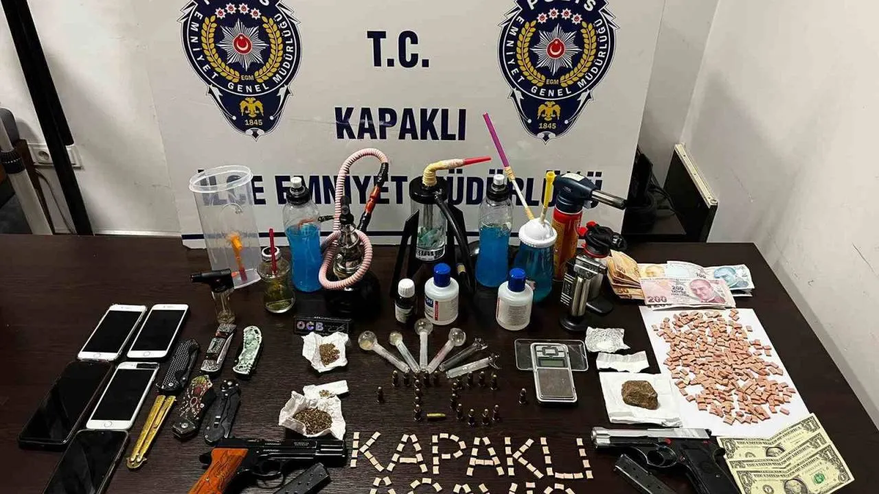 Kapaklı İlçe Emniyet Müdürlüğü ekipleri tarafından uyuşturucuyla mücadele kapsamında İnönü Mahallesi Bülent Ecevit Caddesi’nde ve Atatürk Mahallesi Şehit Öğretmen Neşe Alten Caddesi’nde bulunan iki apartman dairesine operasyon düzenlendi. Emniyet ekipleri tarafından dairelerde yapılan aramalarda 410 adet extacy, 1 adet hassas terazi, 1.95 gram metamfetamin, 3.75 gram bonzai, 47.80 gram taş kubar, 2 adet ruhsatsız tabanca, 2 adet şarjör, 3 adet 1 dolar, bin 440 TL kâğıt para, 22 adet 9.19 mm fişek, 7 adet şaşal, 4 adet pürmüzlü çakmak, 6 adet bong, 1 paket sarma kağıdı, 6 adet bıçak, 5 adet cep telefonu ele geçirildi.