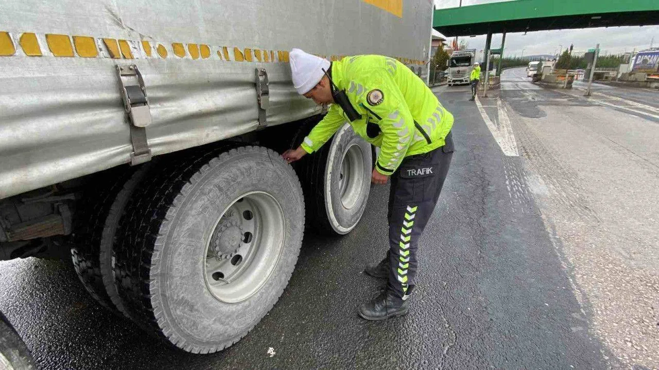 İl Emniyet Müdürlüğü ekipleri, TEM Otoyolu’nda yük ve yolcu taşıyan ticari araçlara yönelik kış lastiği denetimi gerçekleştirdi. Kontrol noktası oluşturan ekipler, araçlarda kış lastiği olup olmadığını, lastik diş derinliklerini ve evraklarını kontrol etti. Uygulamada, sürücülerin araçlarına kış lastiği taktığı görüldü. Denetimden memnun kalan sürücüler, kış lastiklerini taktıklarını ifade ederek, vatandaşlara da bu yönde uyarılarda bulundu.