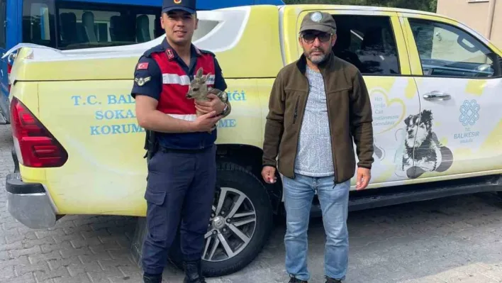 Balıkesir'in Bigadiç ilçesinde devriye gezen jandarma timi ormanlık alanda bulduğu karaca yavrusunu Milli Parklar görevlisine teslim etti.