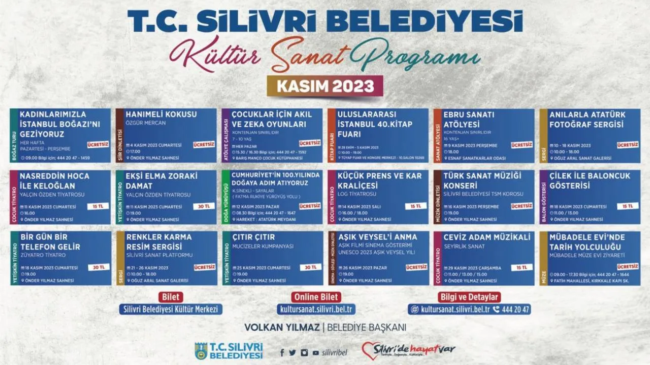 Silivri Belediye Başkanı Volkan Yılmaz’ın “Kültür ve sanatla bezenmiş bir Silivri” vizyonu doğrultusunda çalışmalarını hız kesmeden sürdüren Silivri Belediyesi, ilçede yaşayan bütün vatandaşları kültür sanat etkinlikleriyle buluşturmaya devam ediyor. Silivri Belediyesi Kültür ve Sosyal İşler Müdürlüğü tarafından hazırlanan kültür ve sanat etkinliklerinin kasım ayı programı kapsamında; sergiler, fuarlar, söyleşiler, müze gezileri, doğa yürüyüşü gezileri, boğaz turu gezileri, atölye çalışmaları, müzik dinletileri, sinema gösterimleri, baloncuk gösterileri, şiir dinletileri, yetişkin tiyatroları ve çocuk tiyatroları Silivrili sanatseverlerle buluşuyor. 1-30 Kasım 2023 tarihleri arasında düzenlenecek olan etkinlikler Önder Yılmaz Sahnesi, Oğuz Aral Sanat Galerisi, Esnaf Sanatkârlar Odası, Barış Manço Çocuk Kütüphanesi ve TÜYAP Fuar ve Kongre Merkezinde gerçekleştirilecek.