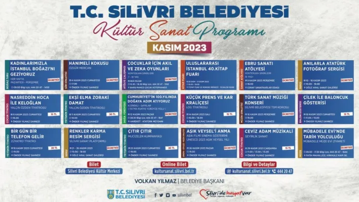 Silivri Belediyesi tarafından hazırlanan kültür ve sanat etkinliklerinin kasım ayı programı kapsamında sergiler, fuarlar, söyleşiler, müze gezileri, doğa yürüyüşü gezileri, boğaz turu gezileri, atölye çalışmaları, müzik dinletileri, sinema gösterimleri, baloncuk gösterileri, şiir dinletileri, yetişkin tiyatroları ve çocuk tiyatroları Silivrili sanatseverlerle buluşuyor.