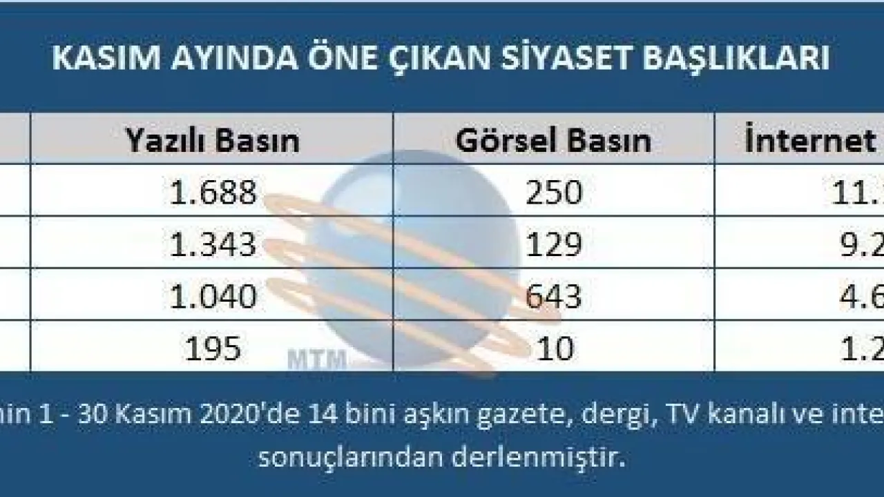 Medya Takip Merkezi (MTM) tarafından hazırlanan raporda, Kasım ayının siyasi ve toplumsal gündemi belirlendi. Yapılan araştırmaya göre, Gazi Mustafa Kemal Atatürk’ün vefatının 82. Yıldönümü’nü anma etkinlikleri, medyada en çok yer alan toplumsal konuların başında geldi.