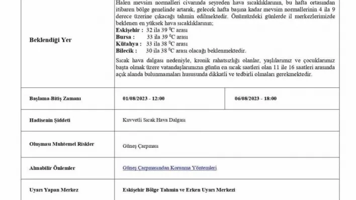 Bursa Valiliği’nin yapılan ve yarın saat 12.00’den Pazar günü 18.00’e kadar sürmesi beklenen uyarıda şu ifadelere yer verildi: "Eskişehir Bölge Tahmin ve Erken Uyarı Merkezince yapılan son değerlendirmelere göre; hava sıcaklıklarının hafta ortasından itibaren 4 ila 9 derece artması beklenmektedir. Yüksek sıcaklıkların meydana getirebileceği (güneş çarpması, vücutta sıvı kaybı gibi) olumsuzluklara karşı özellikle; kronik sağlık problemi olanların, yaşlılarımız ve çocuklarımız başta olmak üzere tüm vatandaşlarımızın günün en sıcak saatleri olan 11.00 ile 16.00 saatleri arasında dikkatli ve tedbirli olmaları, açık alanda bulunmamaları gerekmektedir."