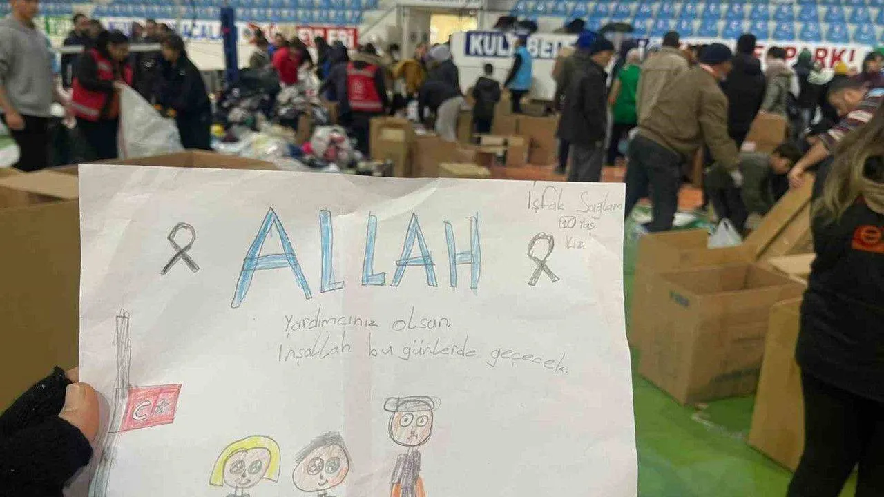 Öte yandan 10 yaşındaki İşfak Sağlam’ın kendi elleriyle çizdiği resim ve üzerine yazdığı not da duygu dolu anlar yaşanmasına sebep oldu. Türk bayrağının göndere çekilmiş halinde bir resim çizen minik kız, korku içerisinde bekleyen vatandaşları da çizip üzerine ’Allah yardımcınız olsun. Bugünler de geçecek.’ notunu yazdı. Kullanılmamış kıyafetlerin üzerine bu notu bırakan minik kız, bir diğer yandan da koli içerisine koyduğu kıyafetlerin arasında çikolata, bisküvi ve şeker de koyduğu öğrenildi.
