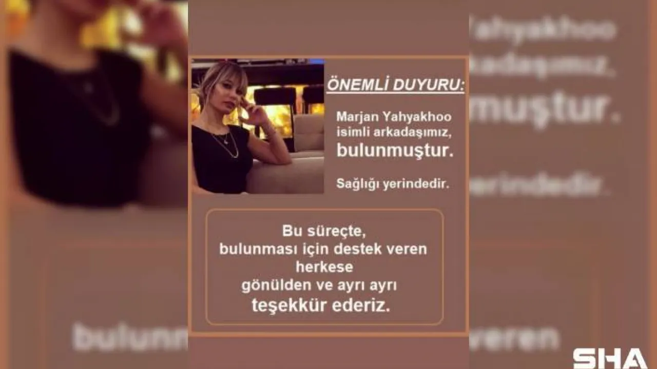 3 buçuk yıldır İstanbul’da yaşayan İran uyruklu Marjan Ahadi (30), geçtiğimiz cuma günü kayıplara karıştı. İddiaya göre emlak danışmanı olarak çalıştığı iş yerinden çıkan Ahadi, Etiler’de sevgilisiyle buluşacağını söyleyerek arkadaşının arabasından indi. Arabadan indikten sonra sevgilisine mesaj attığı tespit edilen Ahadi’den bir daha haber alınamadı. Kayıp olan genç kadının 1’i kadın 3 kişi tarafından kaçırıldığını iddia eden annesi Maryam Ahadi, emniyete kayıp başvurusunda bulundu. Konuyla ilgili Kayıp Şahıslar Büro Amirliği ekipleri çalışma başlattı. Ekiplerin çalışmaları sürerken, Ahadi’nin müdürünün sosyal medya hesabında yaptığı paylaşımla sevindirici haber geldi. Paylaşımda Ahadi’nin bulunduğu ve sağlığının yerinde olduğu kaydedildi.