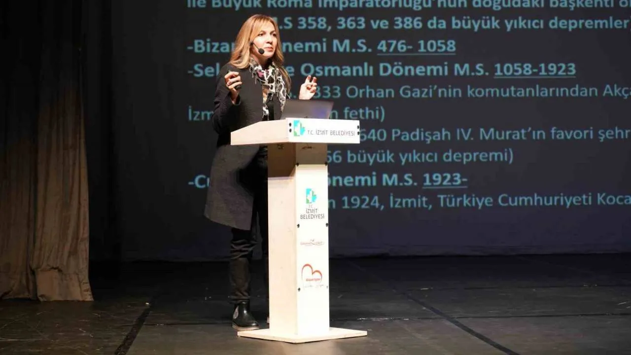 Fatma Kaplan Hürriyet’in konuşmasının ardından kürsüye çıkan Prof. Dr. Tuna Şare Ağtürk, İzmit’in antik tarihi hakkında önemli bilgiler verdi. İzmit’in çağlar boyu önemli bir kent olduğunu ifade eden Ağtürk, "İnanılmaz stratejik bir konumu var. Özellikle Limanı çok önemli. Çağlar boyu önemli bir kent merkezi olarak önemini koruyor. Antik kaynaklara baktığımızda ilk bahsi geçen yerleşim ’Astakoz’. Başiskele’de, Körfez’in güney kısmında. M.Ö. 712 yılında Yunanistan’dan gelen Megaralar koloni kurmuşlar. İlk kayıt burada başlıyor. Sonrasında Helenistik dönem kralı Nikomedes, Nikomedia’yı kuruyor. Nikomedia, Helenistik krallığının başkenti oluyor. Sonrasında Roma İmparatorluğu büyüdükçe helenistik krallığını tek tek aşmaya başlıyor. Bitinya bölgesi de Roma İmparatolupunun parçası haline geliyor. Bu kez de Bitinya eyaletinin başkenti oluyor Nikomedia. Asıl önemi sonrasında başlıyor, Roma İmparatorluğunun parçası olduğu dönemde" diye konuştu.